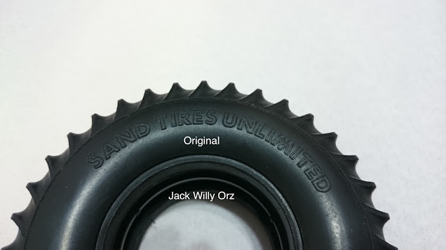 下圖左邊是複製胎,右邊是原始威力一代輪胎.材質來說,原始胎比較軟,複製胎上方刮沙紋路比原始胎硬些.